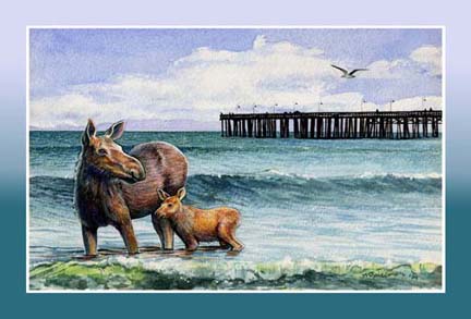 My friend of thirty years, Elisabeth, who lives in Ventura, is originally from Sweden and her favorite animal is the moose. As a birthday present for her, I painted this mommy moose with the Ventura Pier in the background.