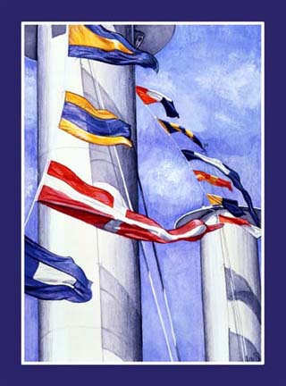 In 1986, Jacques Cousteau’s team aboard his wind ship, Alcyone, began a filming expedition in the Channel Islands. With a garland of pennants draped between her turbosails, Alcyone celebrates her arrival at the Ventura Harbor.