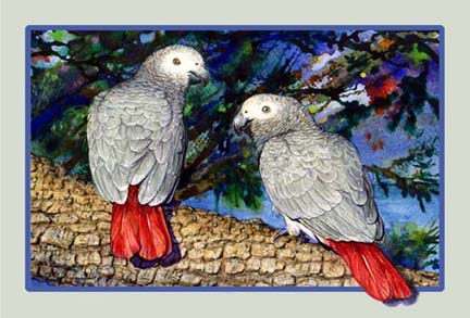 My friends Tak and Ginny had an African Grey named Gandalf who was the model for this watercolor. Greys are incredibly intelligent creatures performing cognitive tasks at the level of dolphins, chimpanzees and even human toddlers.