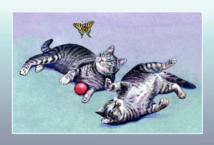 Zeke is my current cat and makes his debut in this painting. His BIG attitude makes me glad he hasn’t a twin. He is smart and aloof but when no one else is looking, he’s just a momma’s boy.