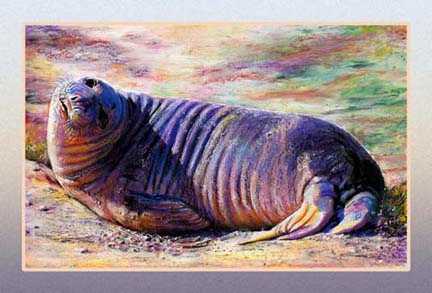 These big babies are weaned when mom abruptly returns to the sea to replenish her reserves. The abandoned pups must further mature before venturing into the sea and find companionship together in groups called “weaner pods.” This drawing was from photos of one especially adorable weaner I encountered while doing intertidal research on San Nicolas Island.