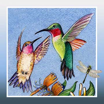 Hummers are the only birds able to fly backwards, and are among the smallest of bird species. Here is a Ruby-throated hummingbird encountering a Rufous hummingbird and a dragonfly for Margaret.