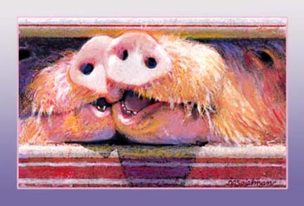 I love pigs. They are intelligent creatures and I don’t believe in eating them. In this drawing, they are singing a duet of a modified Beatle’s song: “Imagine there’s no bacon, it isn’t hard to do; nothing to squeal and die for, no ribs or pork chops too.”