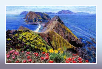 The spectacular view at the end of the trail on East Anacapa Island looks towards Middle and West Anacapa. Way in the blurry pastel distance is Santa Cruz Island.