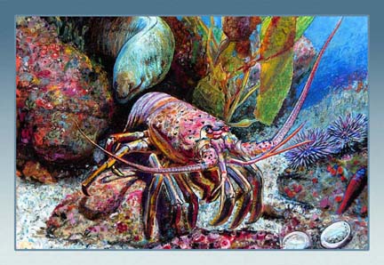 California spiny lobster, or “bugs,” as local divers call them, hole up during the day, venturing forth at night to scavenge. I have surrounded this one with other rocky reef residents. Behind is a moray eel, and on the far right are abalone shells, purple sea urchins and a blue-banded goby.