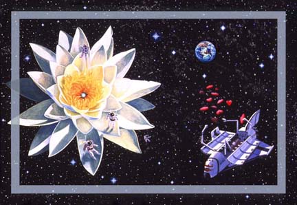 The lotus flower emerges from murky water, perfect and unspoiled. In many cultures and religions, it has therefore come to symbolize purity and spiritual awakening. In the background of this piece, the Space Shuttle is releasing (or maybe collecting) a payload of hearts.
