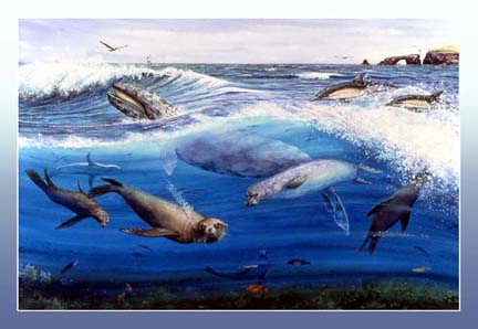 In 1994, the city of Ventura commissioned me to create four marine-life panels to be transferred onto porcelain-coated steel and permanently installed on the Ventura Pier. This one identifies the common marine mammals found along our coastline.