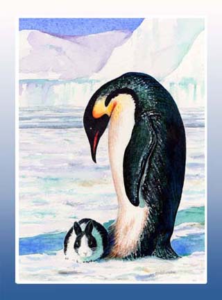 Many of my friends have tried online dating services like Match.com. Sometimes the matches are mismatches, like the two in this picture. I actually painted these animals together for a friend, Rita Bell, who collects both penguins and rabbits.