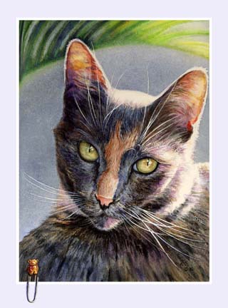 This watercolor painting was commissioned by my friends Ken and Melinda. Mitsy was their beloved cat who had a quirky fondness for paperclips. She was adorable, posing for every one of my photographs.