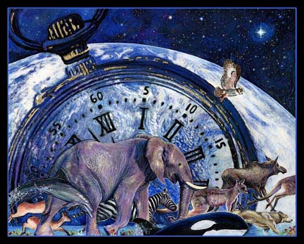 As the timepiece indicates, it could be the eleventh hour for life on earth, as we know it. But I remember Capt. Cousteau saying that if you looked at the facts and statistics with mind and reason, yes, it was hopeless, until you looked with your heart—then all things suddenly became possible. (The original is owned by dear friends—Estrella and Teresa.)