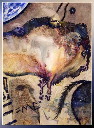The first prehistoric cave paintings were found in Altamira, Spain, created 25-35,000 years ago. The dark lines are copies of the bison from the cave through which I have woven artifacts and symbols from past and present civilizations. It is a montage of artistic quest, through time, exploring the mystery of why we are here. (The original is in the collection of my friends, Al and Carol Calvin.)