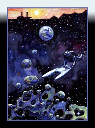 Sure, it could have been the Big Bang that started it all…or…it could have been the Big Bloop. At least that is the sound I hear when I look at these tiny worlds rising from their matrix like invertebrate eggs launched into the plankton. Meanwhile a Cousteau Diver scouts the action.