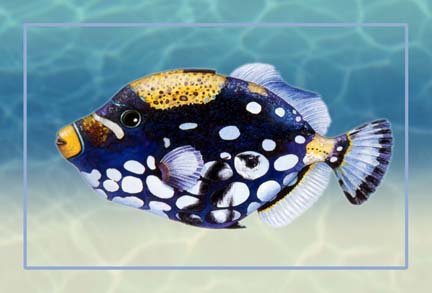 Mother Nature had some fun when she designed the Clown triggerfish. And so did I—turning spots into feline portholes. The original background was white but I decidfed it needed embellishment.