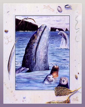 Anacapa arch, gray whale, dolphins, harbor seal, sea lion, otter, kelp, olive shell, abalone, Chumash whale symbol, pelican—the Channel Islands—all in my backyard!